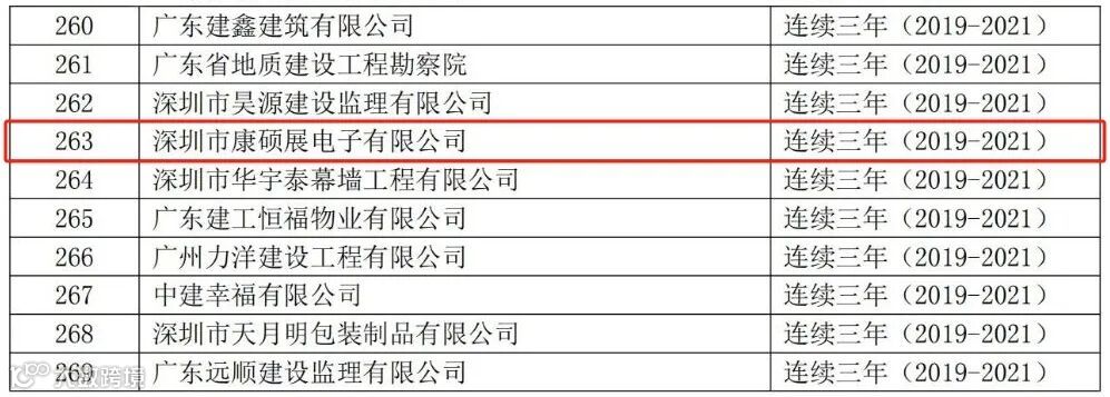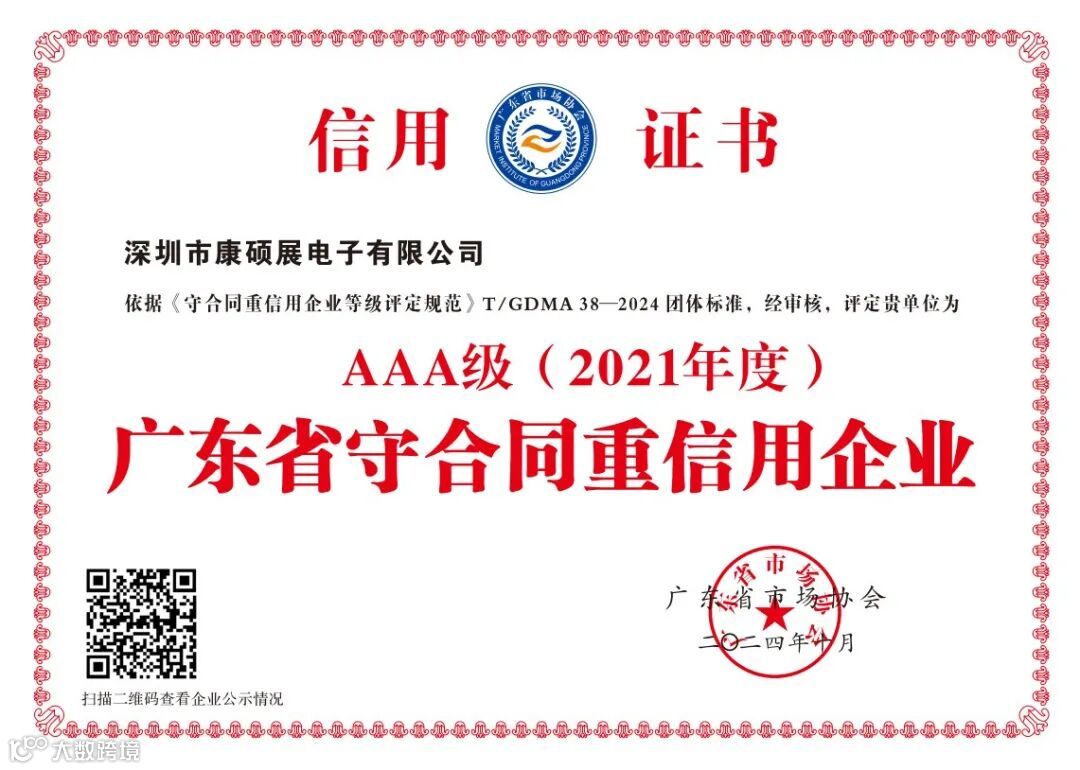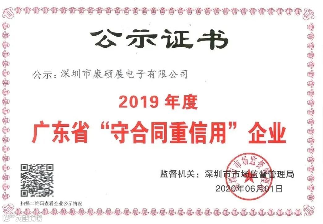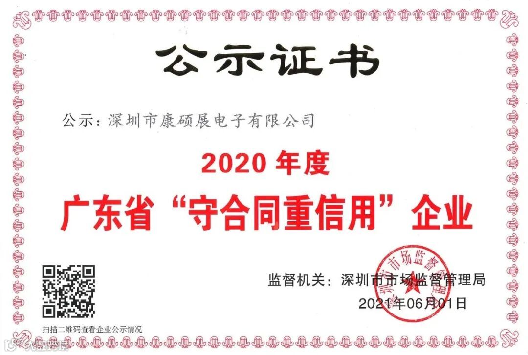 近日,广东省市场协会公示了2021年度“守合同重信用企业”(第一批)评定结果。康硕展再次荣获“广东省守合同重信用企业”荣誉称号,这是康硕展连续3年获得此殊荣。