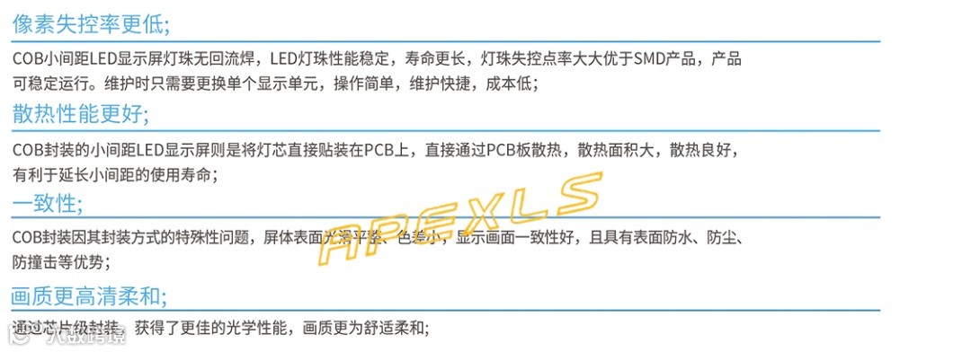 COB小间距屏,是一种新型的集成式封装方式——COB(板上芯片)封装,直接将LED裸芯片封装到模组基板上,然后进行整体模封。COB封装的模组具有制造工艺流程少、封装成本较低、封装集成度高、显示屏的可靠性好和显示效果均匀细腻等特点,有望成为未来高密度LED显示屏模组的一种重要的封装形式。