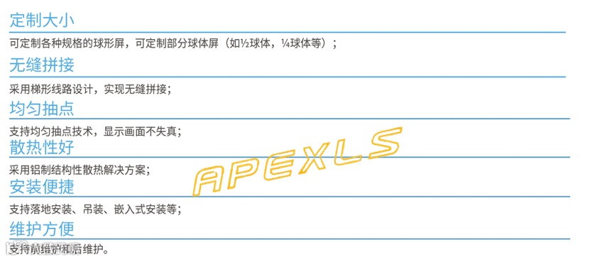 康硕展的球形屏多应用于博物馆、科技馆、企业展厅、展览馆、户外球形视屏广告、 装饰亮化工程等场景。其安装方式分为落座式、吊装式、镶嵌式、嵌入式等,可根据不同的场景满足客户多样化的需求。
