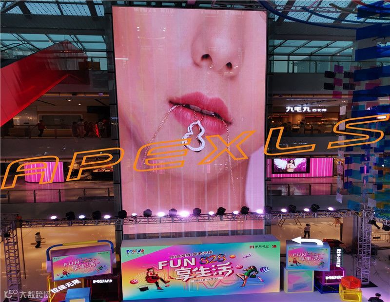 位于美林M·LIVE天地商场中庭观光电梯正面的,是雷曼康硕展P3.91-7.8户内透明全彩显示屏。这块屏既是广告传播媒介,同时也是打造商场良好购物氛围不可或缺的应景设计之一。