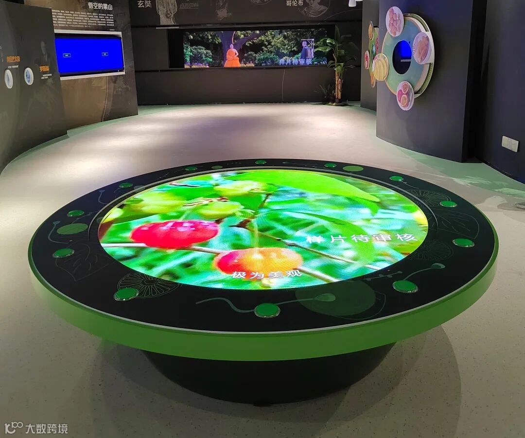 “世界奇珍”展厅设有前世今生、朝贡上品、奇珍版图、水果故事、水果传说、异域特色六大区域,展现多元的水果文化。通过触摸展厅的圆形电子沙盘,访客能够深入地了解水果的文化、传说和故事。