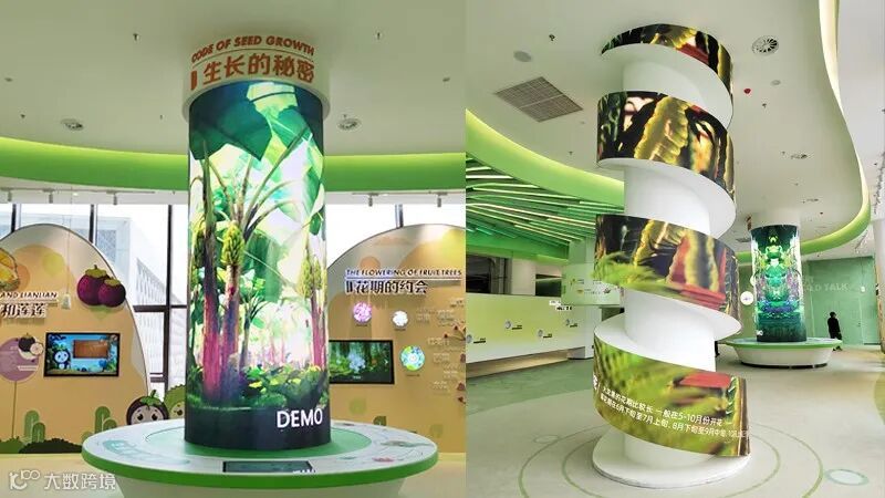 在“生长的秘密”及“花期的约会”区域,LED圆柱屏和LED螺旋屏联合呈现,独特的创意造型,精彩的视觉效果,向观众展示香蕉、火龙果等水果的生长及花期秘密。