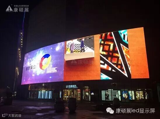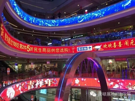 康硕展为广东中山远洋•大信新都会商场设计的LED弧形屏,包括三块弧形LED显示屏,采用P6表贴LED显示屏,面积达283平米,极富创意设计和良好的显示效果受到业主和现场观众的一致好评。