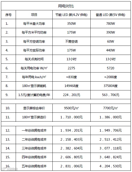 二、 P16 节能LED显示屏与普通屏5年保修期总体拥有成本对比