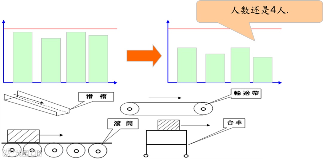 通过改善,使各制程的C/T降低,则为省力化。省力化一般通过使用传送工具(例如:滑槽、输送带、滚筒、台车)和夹(治)具来实现。