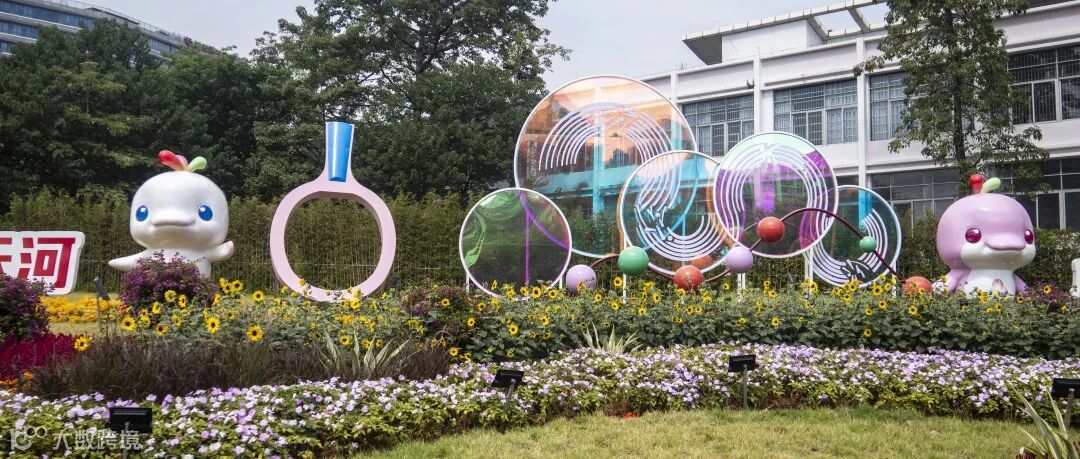 天河区立体作品共有8组,整体设计动静结合,通过现代材质与灵动造型将地域特色、体育盛况与吉祥物巧妙融合,搭配多彩花卉,既彰显了天河区绿色生态的发展理念,也表达了广州喜迎第十五届全运会的开放胸怀与蓬勃活力。
