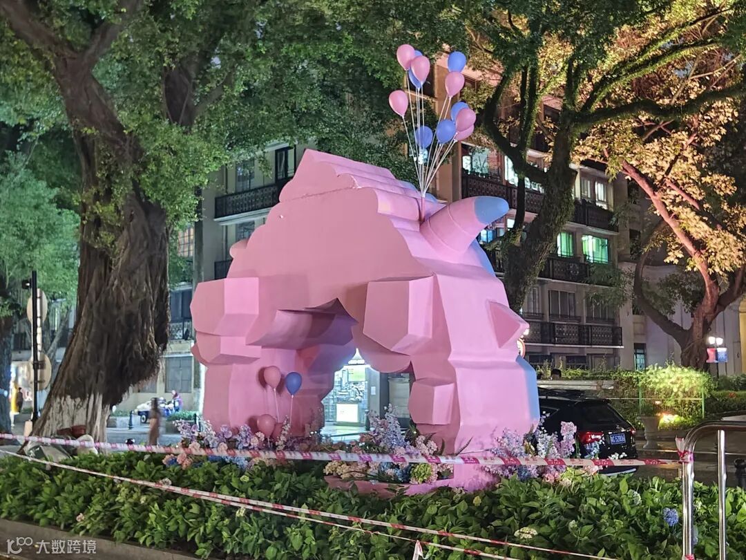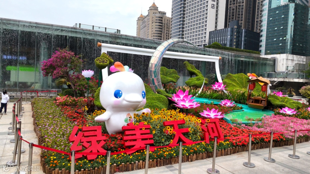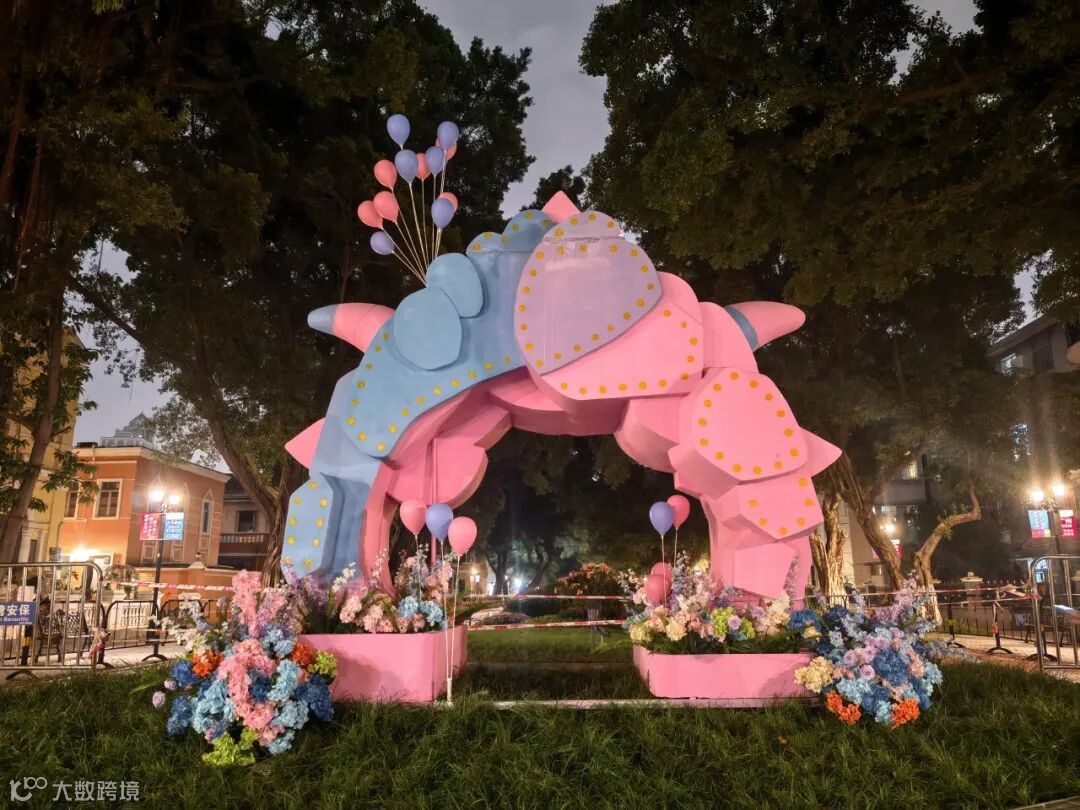 该作品以绿美广州IP“绿美羊”为核心形象,结合花艺等现代公共艺术设计手法,通过兼具童趣互动性与文化传播性的美陈装置,传递欢乐、积极的城市氛围。