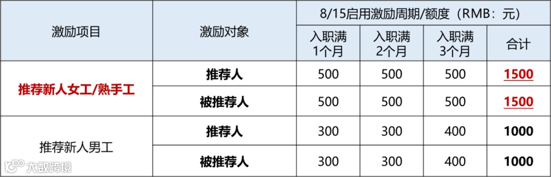 因应公司订单增长人力储备,公司持续每天办理招聘面试手续。8月15日起调整增加推荐女工及推荐复职老人激励额度,依入职日期核算激励: 请主管向部属倡导招募激励信息,满足公司用人需求。