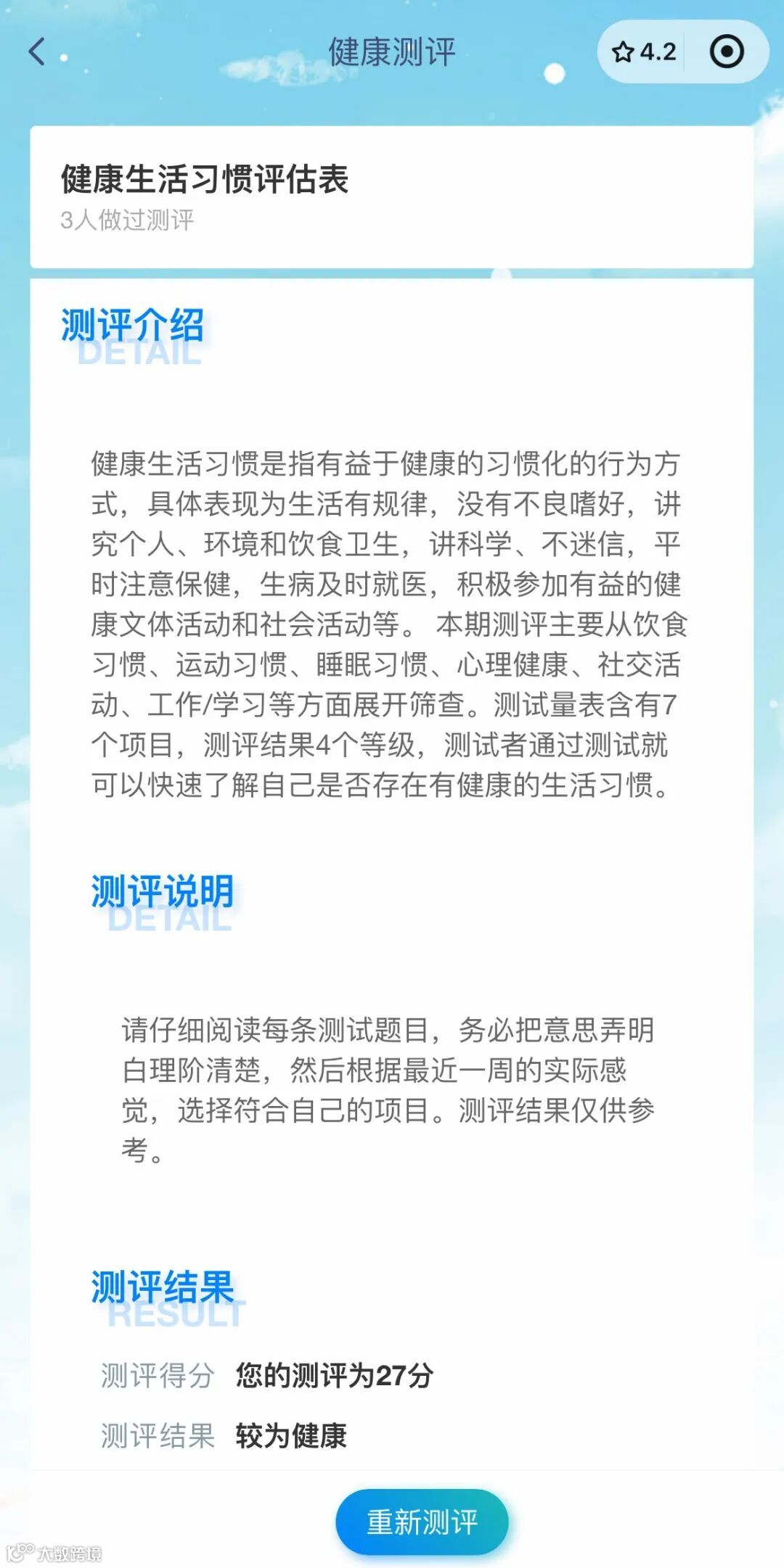 系统定期更新健康测评项目,同仁可根据自身情况进入测试。