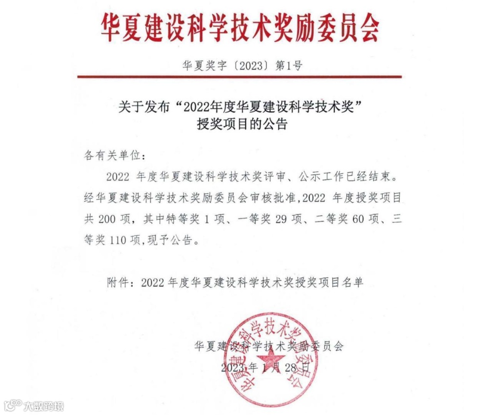 2023年1月28日,华夏建设科学技术奖奖励委员会公布了2022年度华夏建设科学技术奖授奖名单。