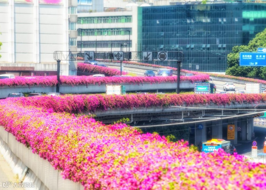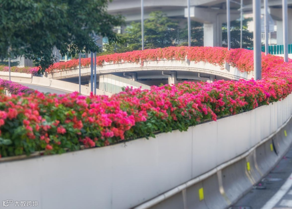 本项目以簕杜鹃为主要绿化植物,经过我方技术人员前期施工和后期养护,在有效的利用空间建设立体绿化,通过对勒杜鹃进行控水、施肥、种植土基质研究、药物激素技术处理等多方面花期调控技术使苗木达到盛花期,打造三季有花乃至四季有花的景观效果,展现空中花廊的美丽风景,为广州市增添新的艳丽色彩,呈现“百花盛放”的美景。