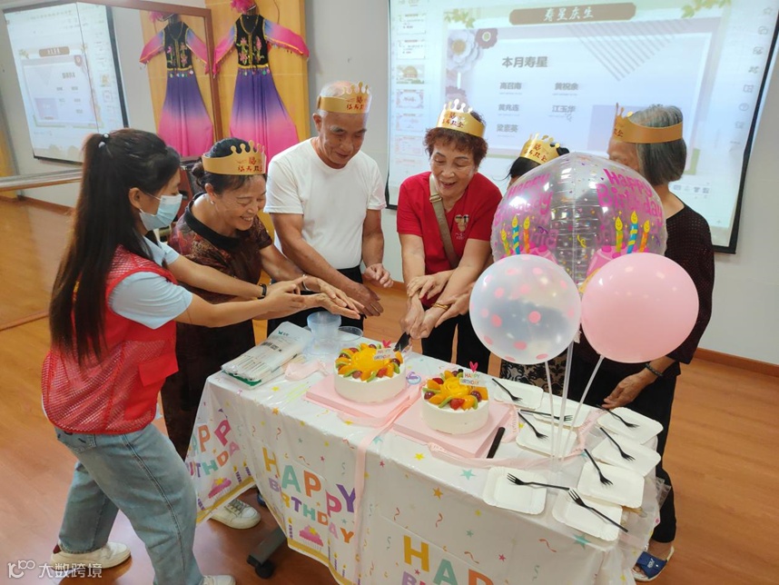 寿星共贺送祝福,活动现场为下半年生日的长者合唱生日快乐歌曲。两个精美的生日蛋糕被缓缓推到长者们面前,蛋糕上插着代表生日祝福的蜡烛,社工邀请了本月生日的长者吹蜡烛切蛋糕。活动现场还为每一位长者准备了生活用品等贴心礼物。