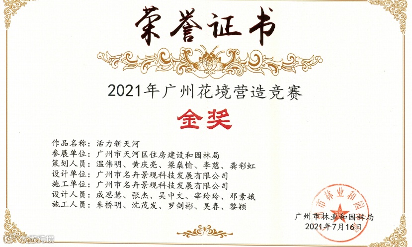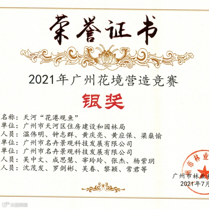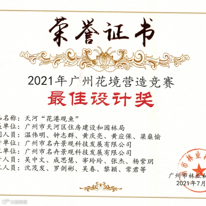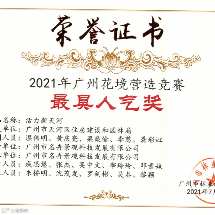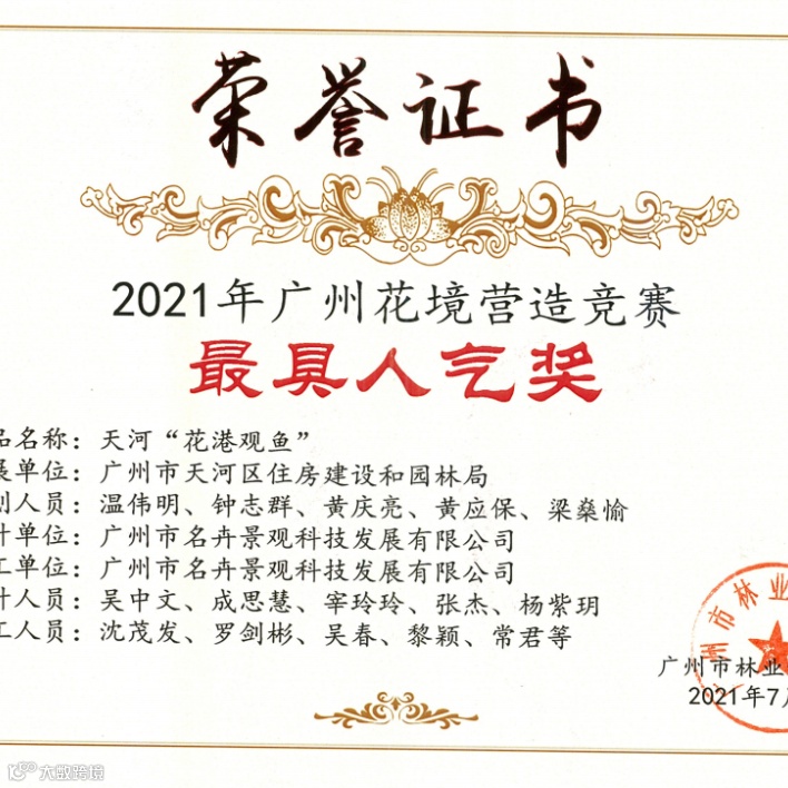 由广州市林业和园林局举办的以“多彩花境,献礼建党100周年”为主题的2021年广州最美花境活动于2021年5月11日开始,经专家评选与网上市民热情投票,结果于7月评选得出,名卉公司积极参与此次活动,并荣获多项奖项,近日领取了相关荣誉证书。