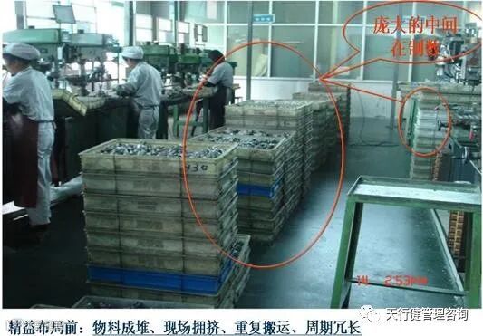 同时,由于功能性布局,将工序人为切割,致使工艺路线错综复杂,中间过程搬运多,搬运距离遥远,产生了大量的搬运浪费,进一步影响了生产效率和制造周期。