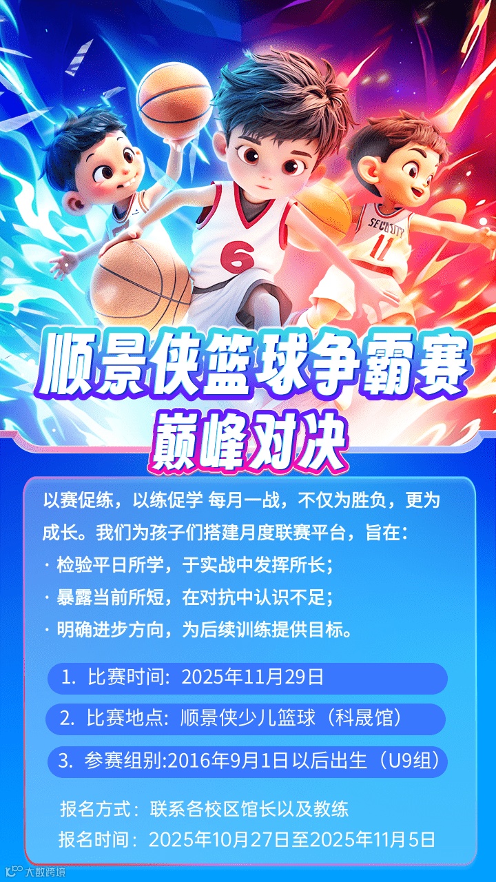 篮球是成长的舞台,每一滴汗水都是未来的见证。让我们共同期待,29、30日两天U9、U10组球员们,在赛场上绽放出属于他们的、更加耀眼的光芒!