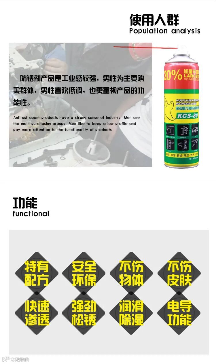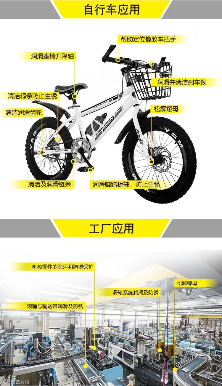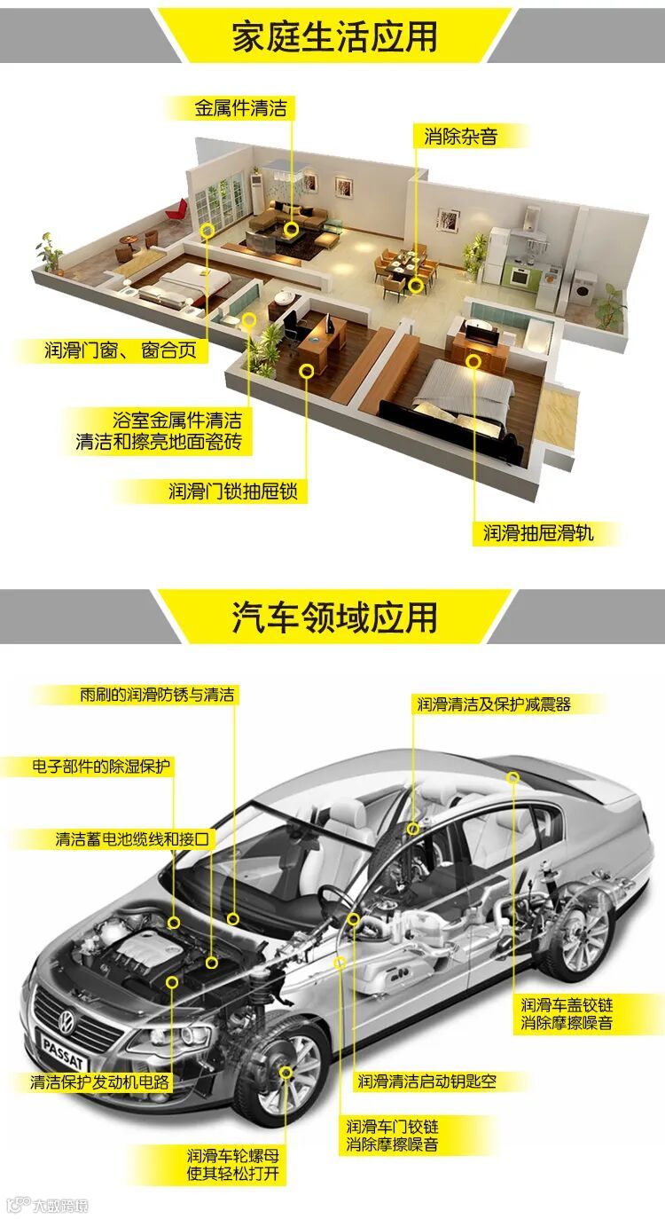 广泛用于钢、铜、铝、镀锌、镀镉等各种金属制件及其组合件的防锈或包装封存防锈。具有超强的防锈及清洁、快速松解生锈部件、轻松解化粘固杂质、排除金属湿气、润滑及电导特性。同时挥发作用于金属表面,形成一层保护薄膜,防止金属锈蚀的一种工业及家庭必备的万能防锈润滑剂。