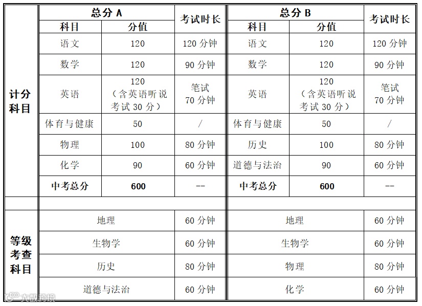 今年,文化课考试较往年推迟一个月,安排在7月20-22日进行,个别科目考试时长有所调整。中考总分满分从530分调整为600分,继续设置总分A和总分B分别对应A、B两类招生计划,每位考生有A、B两个总分,具体见下表: