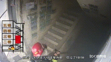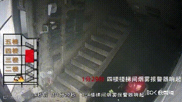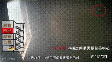 1分35秒,4楼房间烟雾报警器响起。1分40秒,4-5楼梯间烟雾报警器响起。