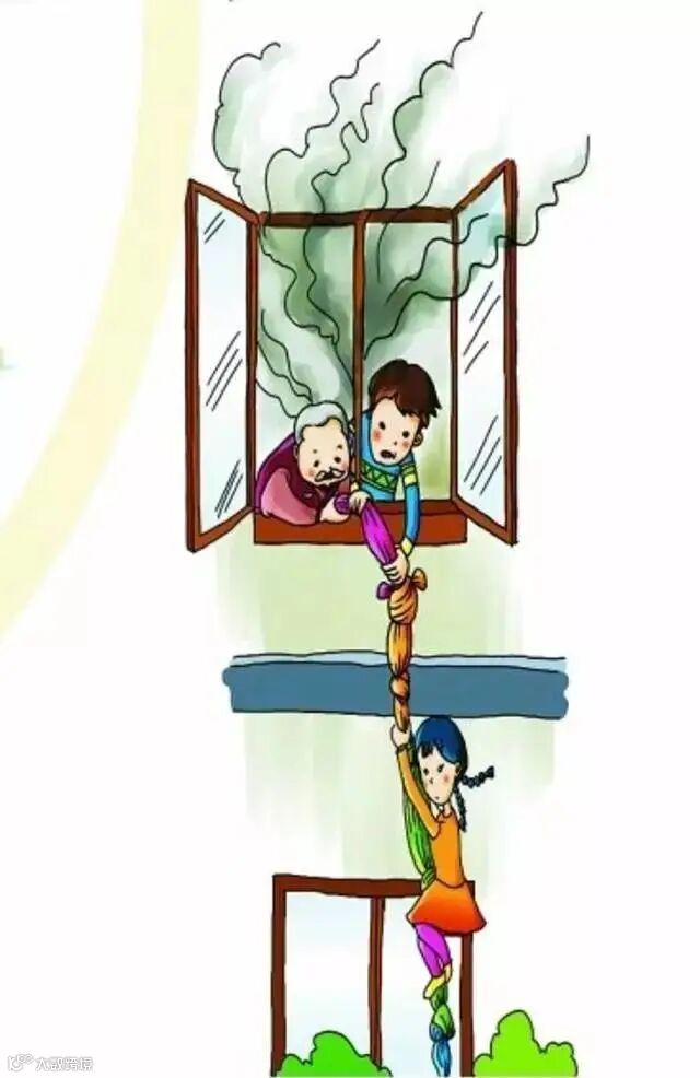 4、要提醒大家的是,如果情况危急,可利用身边床单、窗帘、衣服等自制简易救生绳,从窗台沿绳缓滑到下一楼层或地面,安全逃生。