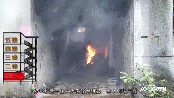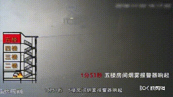 1分51秒,5楼房间烟雾报警器响起。整栋五层楼便已被浓烟所笼罩。