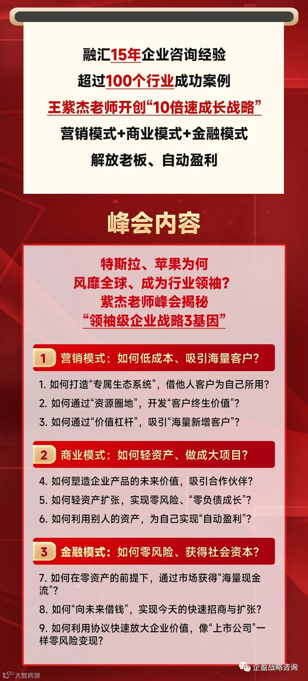 导读:融汇15年企业咨询经验超过100个行业成功案例王紫杰老师开创“10倍速成长战略”营销模式+商业模式+金融模式解放老板、自动盈利