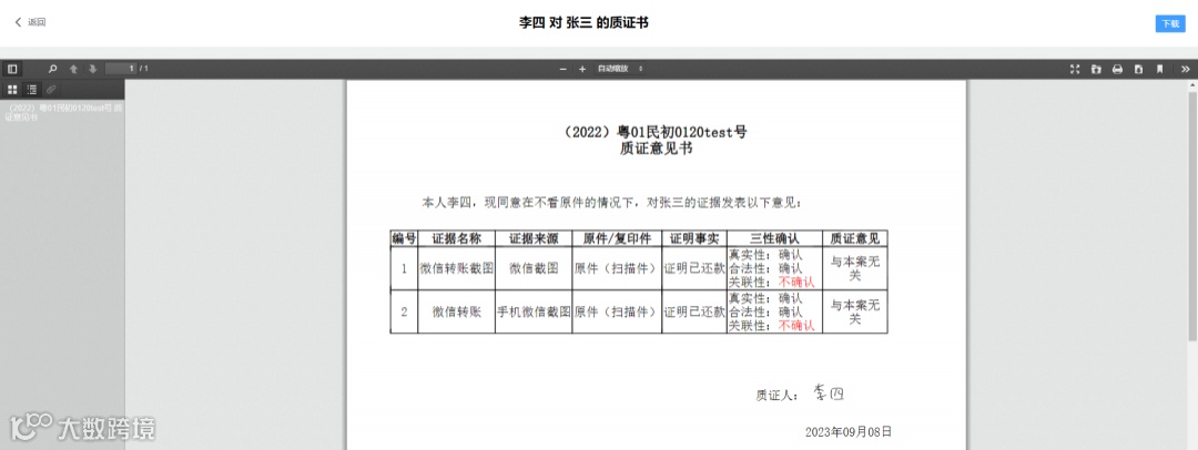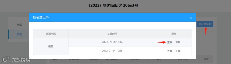 签名并提交质证意见后,在质证列表就能看到签名的质证意见书。