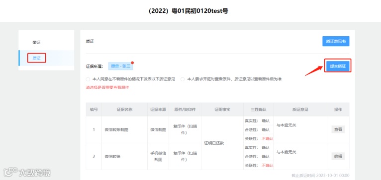 在一方当事人完成举证后,法官可将相关证据推送至其他当事人。其他当事人收到短信后,即可登录系统,选择质证界面,对提交证据材料的真实性、合法性和关联性进行确认,注意要在质证截止时间前完成质证。