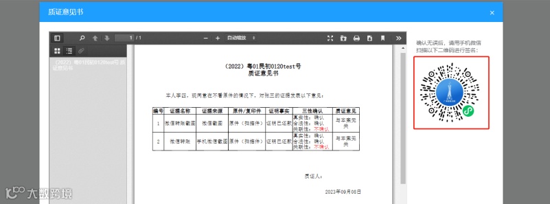 编辑好质证意见后,点击“提交质证”。然后用手机微信扫码,对质证意见书进行签名。