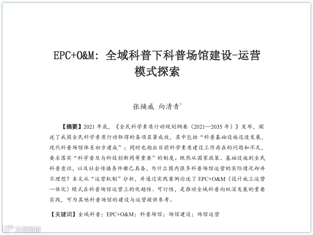 近日,中国自然科学博物馆学会2022年年会征文评选结果出炉,我司论文《EPC+O&M: 全域科普下科普场馆建设-运营模式探索》被收录入学会论文集。