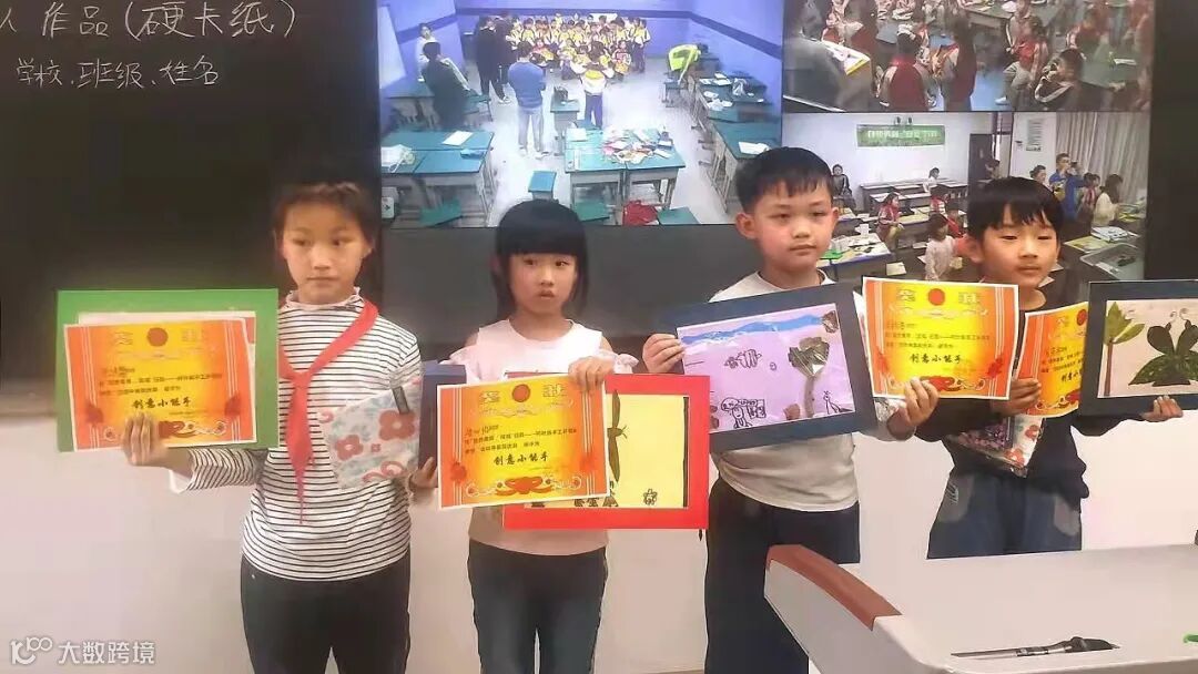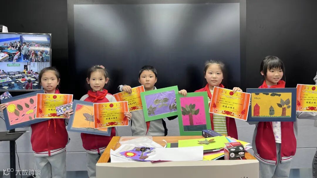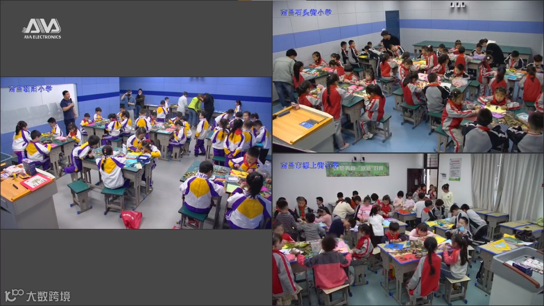 本节课程由简格民老师在朝阳小学主讲,通过使用奥威亚的“云+端”产品和技术服务,另外两校的同学们也在远端上了这节公益同步课堂,一起学习环保手工画制作,并交流互动,优质的公益课程得以共享传播。