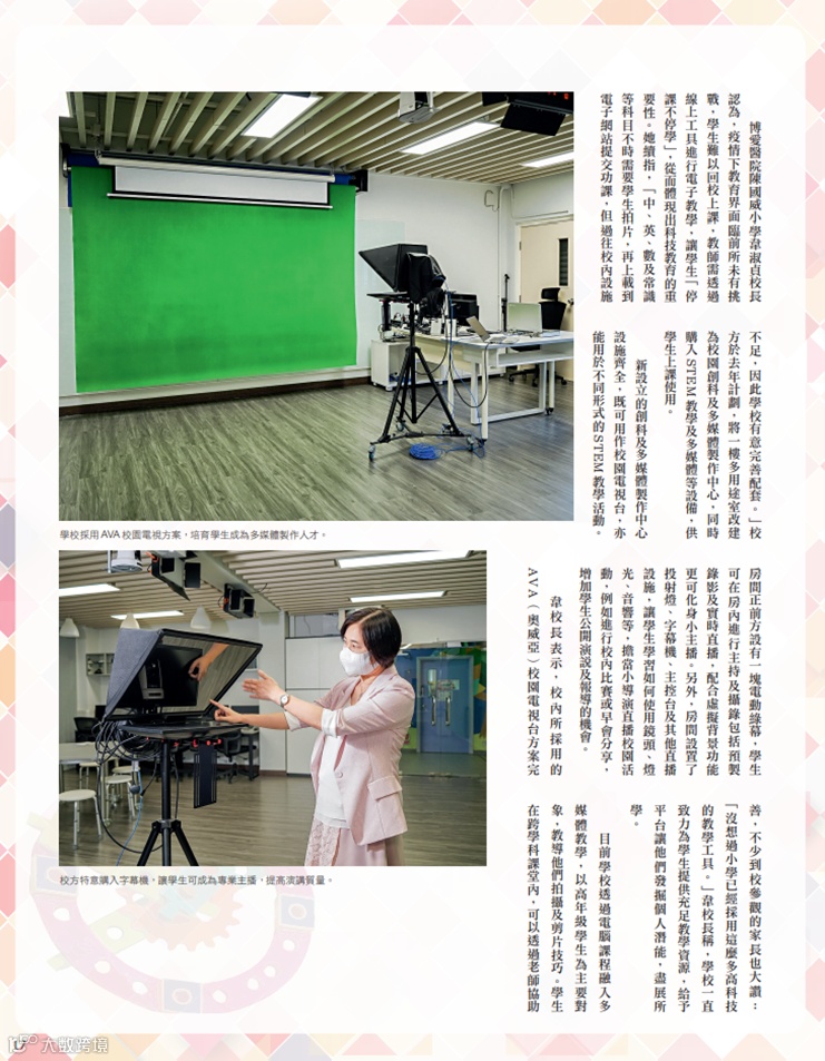 多媒体制作中心内采用奥威亚校园电视台方案,为学生提供了公开演讲与报道的平台。学生可在教学室内学习拍摄与剪辑技巧,在老师的协助下录制短片,或尝试担任校园电视台主播,直播分享校内比赛、早会等校园活动,培养表达与沟通能力。