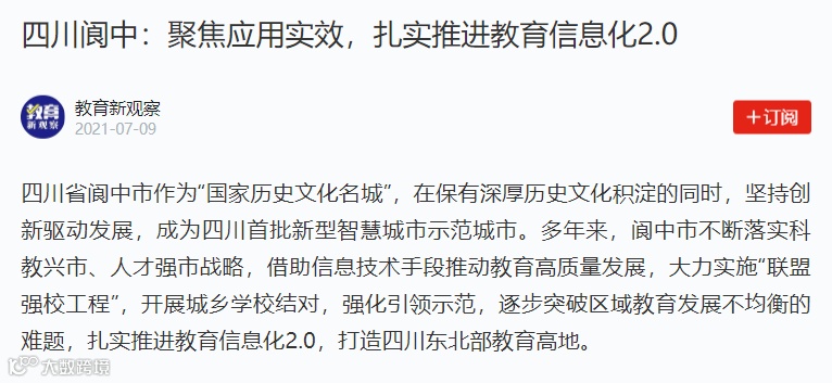 四川省阆中市作为“国家历史文化名城”,在保有深厚历史文化积淀的同时,坚持创新驱动发展,成为四川首批新型智慧城市示范城市。多年来,阆中市不断落实科教兴市、人才强市战略,借助信息技术手段推动教育高质量发展,大力实施“联盟强校工程”,开展城乡学校结对,强化引领示范,逐步突破区域教育发展不均衡的难题,扎实推进教育信息化2.0,打造四川东北部教育高地。
