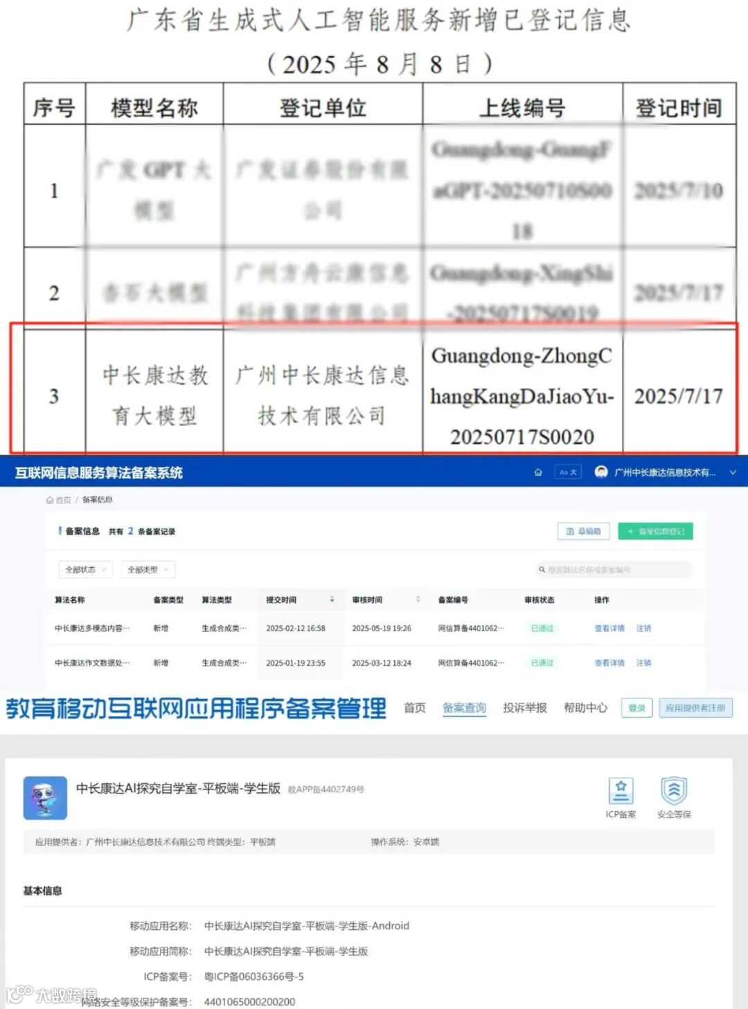中长康达AI探究自学室系列产品成功通过三项权威备案,分别是广东省生成式人工智能服务登记、境内深度合成服务算法备案和教育移动互联网应用程序备案。未来,中长康达将继续以“科技赋能教育”为初心,深耕教育AI未来。