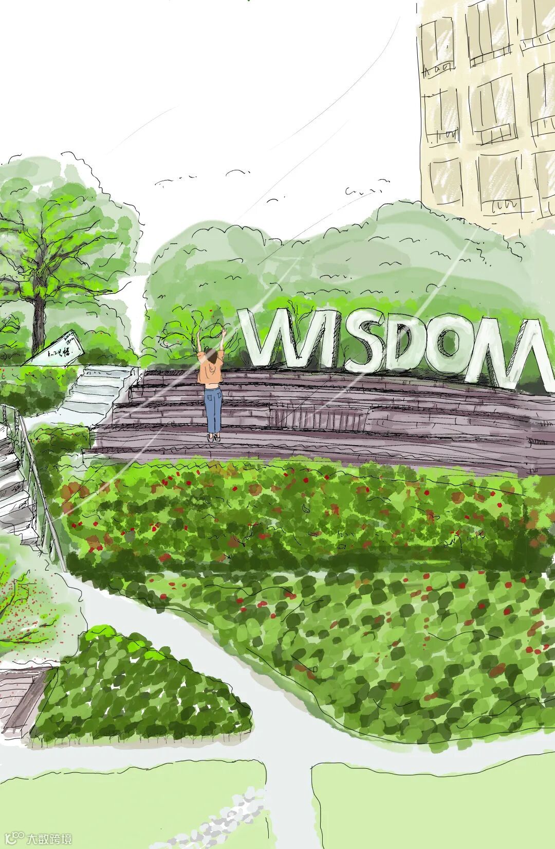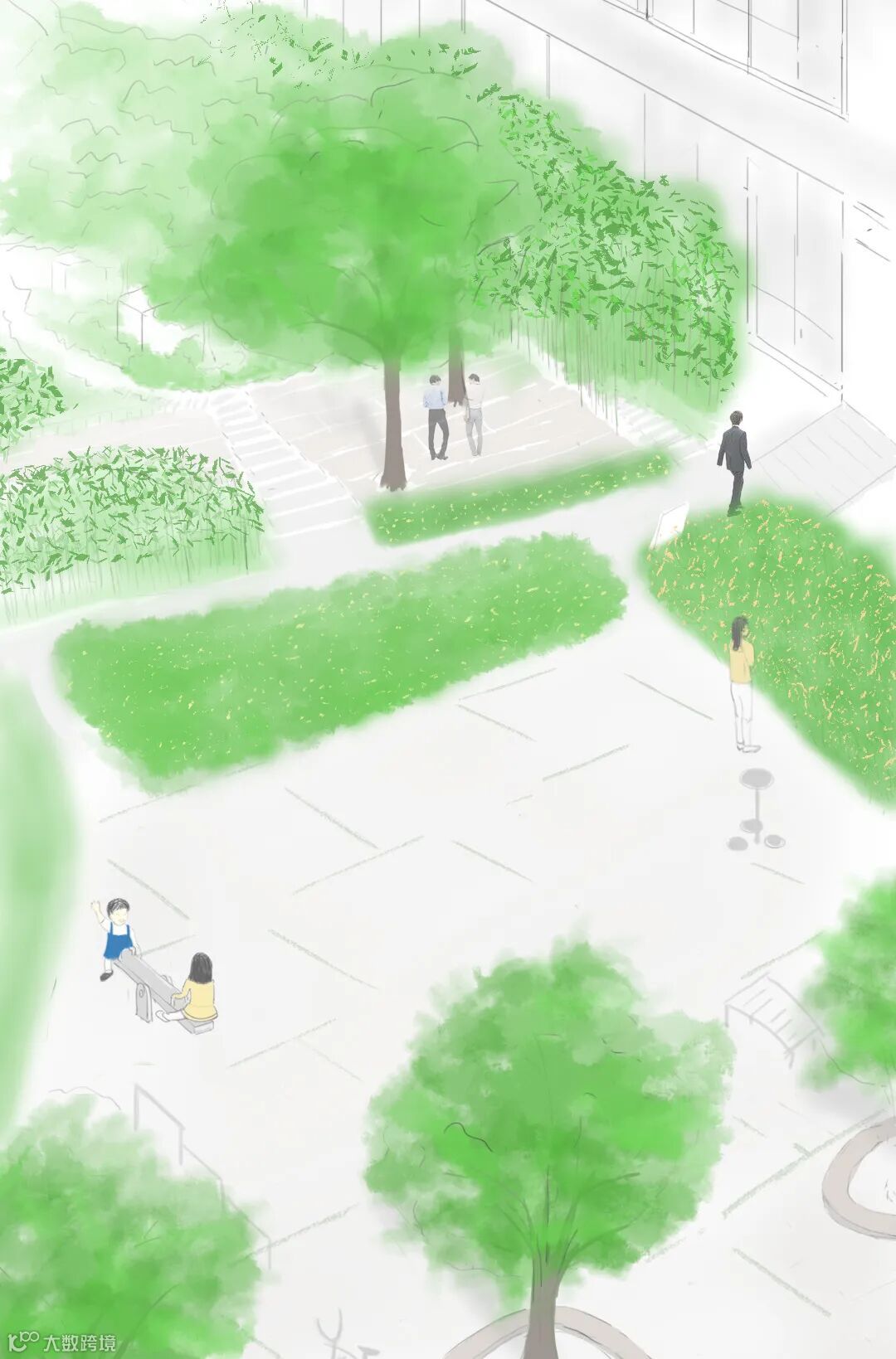 如果绿植鲜花是温婉气质,那搭配点运动素材,就有英气了。园区西广场特意留出空间,在绿意环绕之间,那些运动设施赋予人力量感。