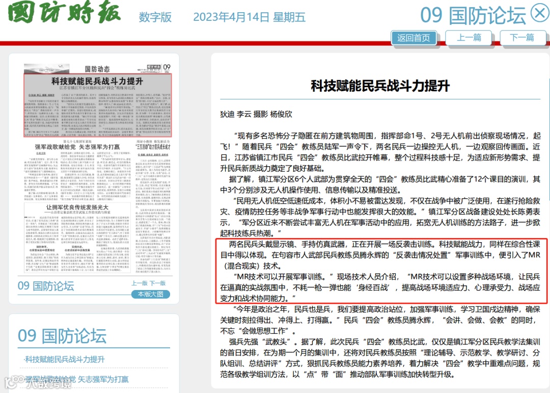 国防时报报道燧光MR技术支持江苏省某军分区军事训练
