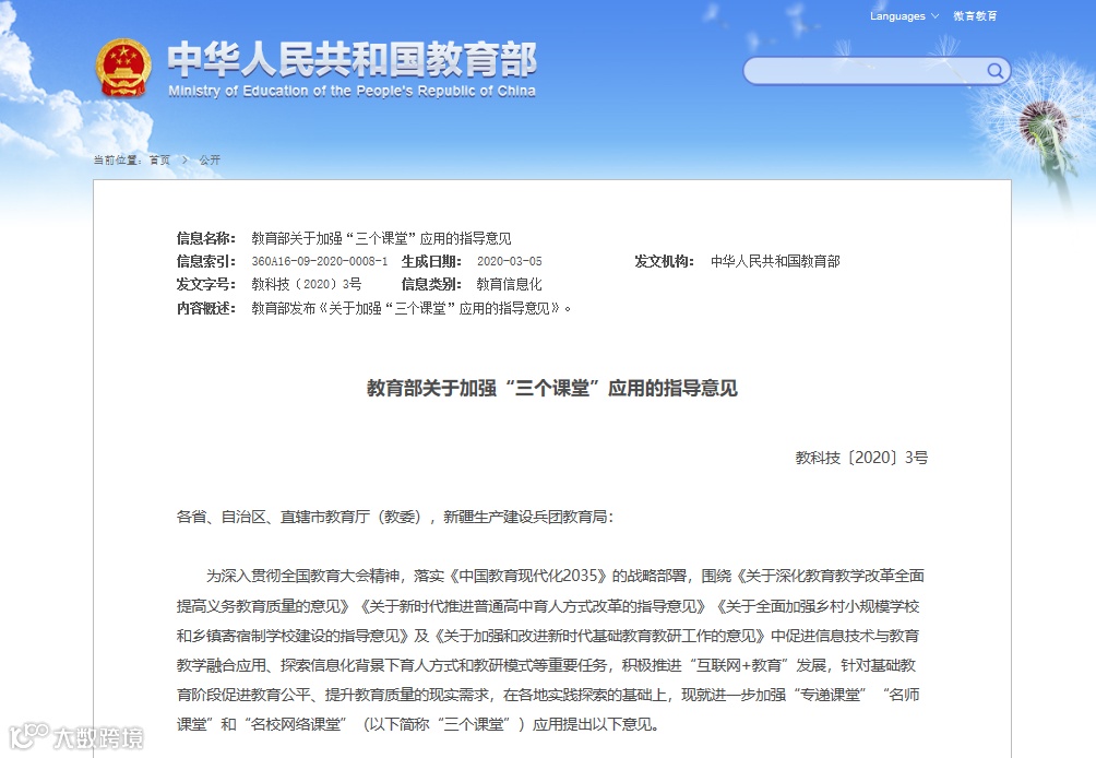 2020年3月,教育部发布了《关于加强“三个课堂”应用的指导意见》,要求到2022年,全面实现“三个课堂”。