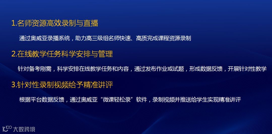 目前,奥威亚已助力全国各地多所高中开展备考辅导,让高三学子足不出户即可完成高效的互动教学,真正实现了“停课不停学”。下一站,奥威亚将致力于打造最适合中国教育的视频互动云,并以此为核心为全国各地教育局构建“全联接教学体系”,为建设教育强国作出更大贡献。