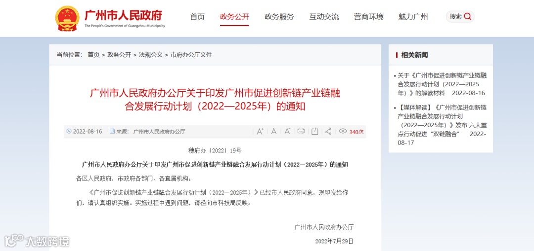 8月16日,广州市人民政府官网公布了《广州市人民政府办公厅关于印发广州市促进创新链产业链融合发展行动计划(2022—2025年)的通知》(以下简称《行动计划》)。将实施六大重点行动,形成至2025年,以新动能为主导的经济发展格局,重点领域创新链产业链深度融合,打造具有全球影响力的科技和产业创新高地主阵地。