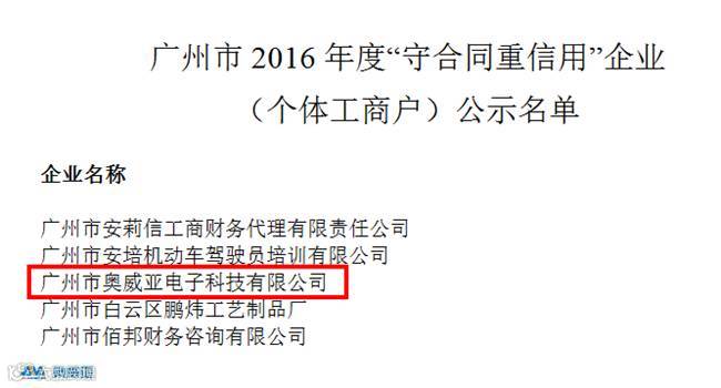 近日,广州市工商局和广州市工商行政管理局发布了2016年度“守合同重信用”公示企业的名单,广州市奥威亚电子科技有限公司榜上有名!“守合同重信用”称号的颁发,是对奥威亚诚信经营、守法经营的高度肯定。