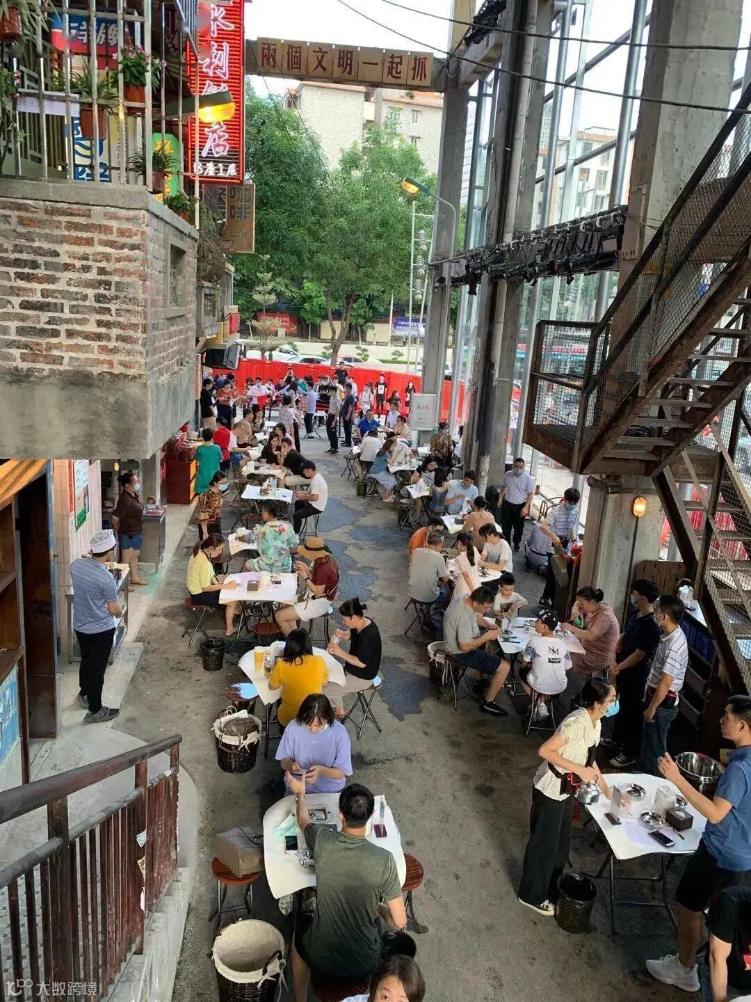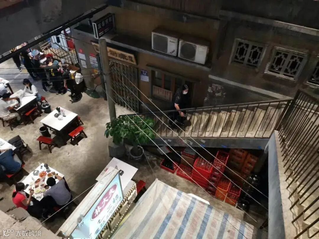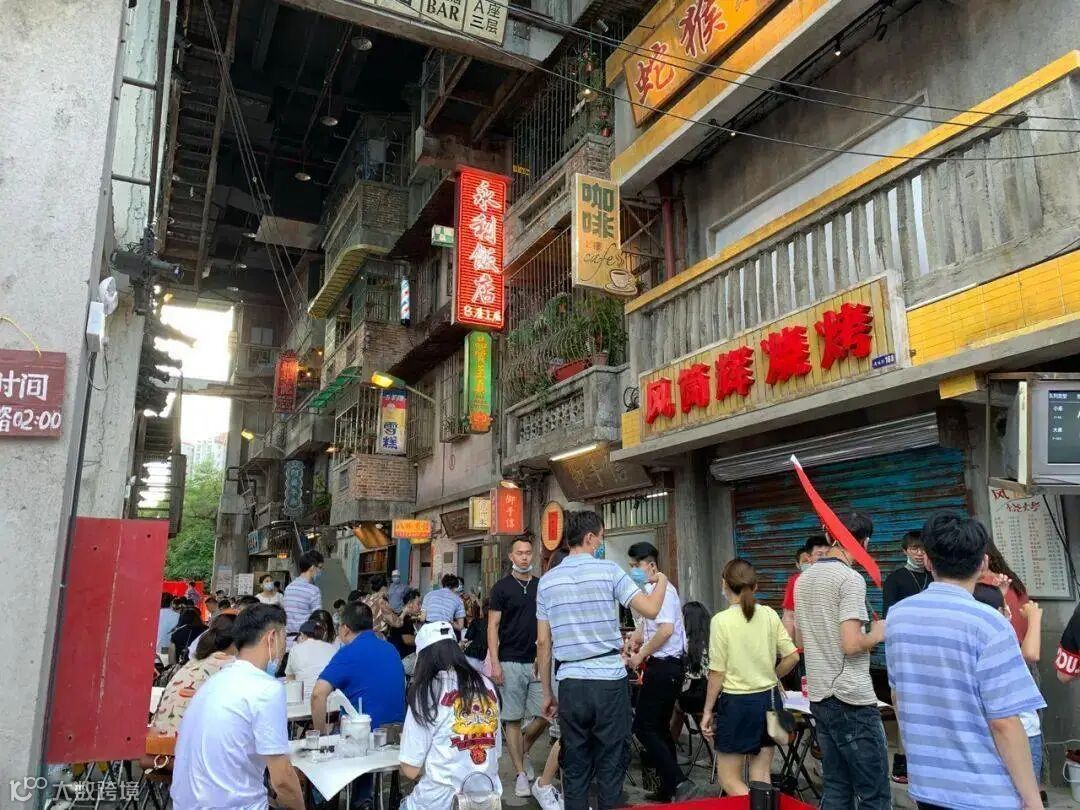 天河太古汇旁的一家“巨型钉子户”,在闹市中充满人间烟火气。土味红砖房,旧时霓虹灯牌,横梁上悬挂着“五讲四美三热爱”标语,还有老式的小吃、饮料档口、宾馆等,在繁华的现代建筑映衬下,其复古又市井的设计,带给人强烈的视觉冲击。