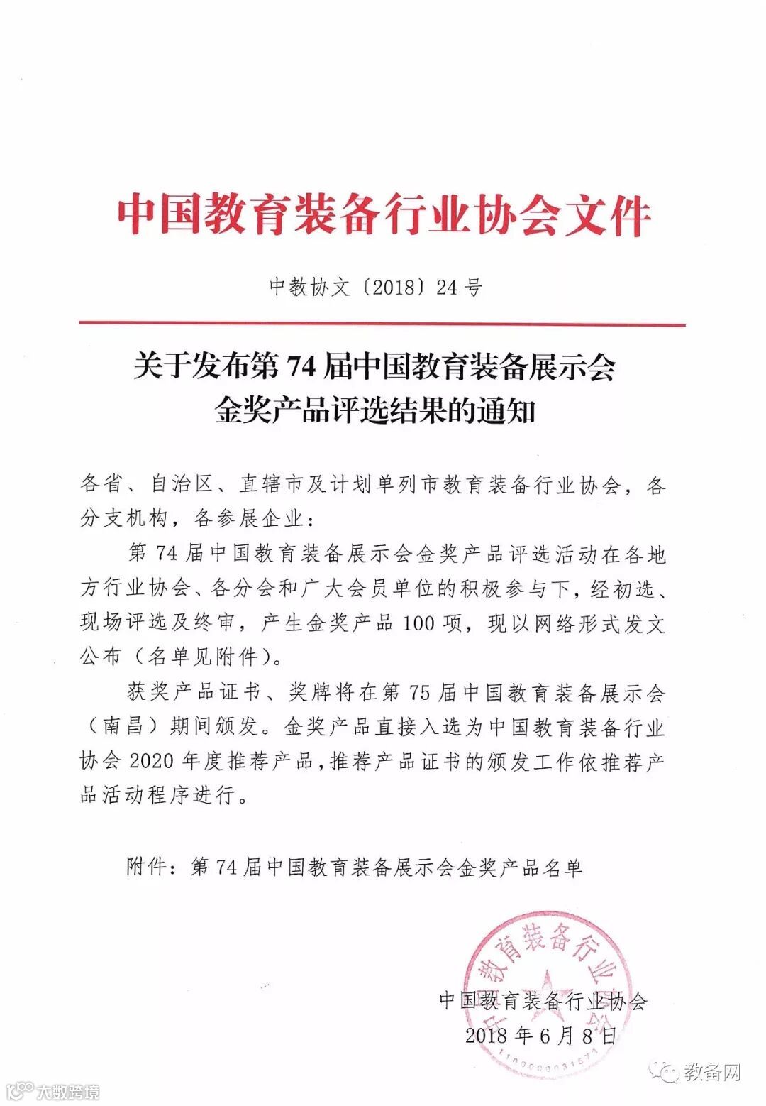 第74届中国教育装备展示会金奖产品评选活动在各地方行业协会、各分会和广大会员单位的积极参与下,经初选、现场评选及终审,产生金奖产品100项,现以网络形式发文公布(名单见附件)。