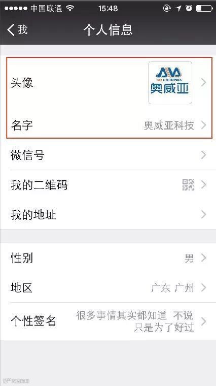 2,从微信上找到“个人信息”栏目,首先更换logo头像,再修改昵称为“奥威亚科技”。