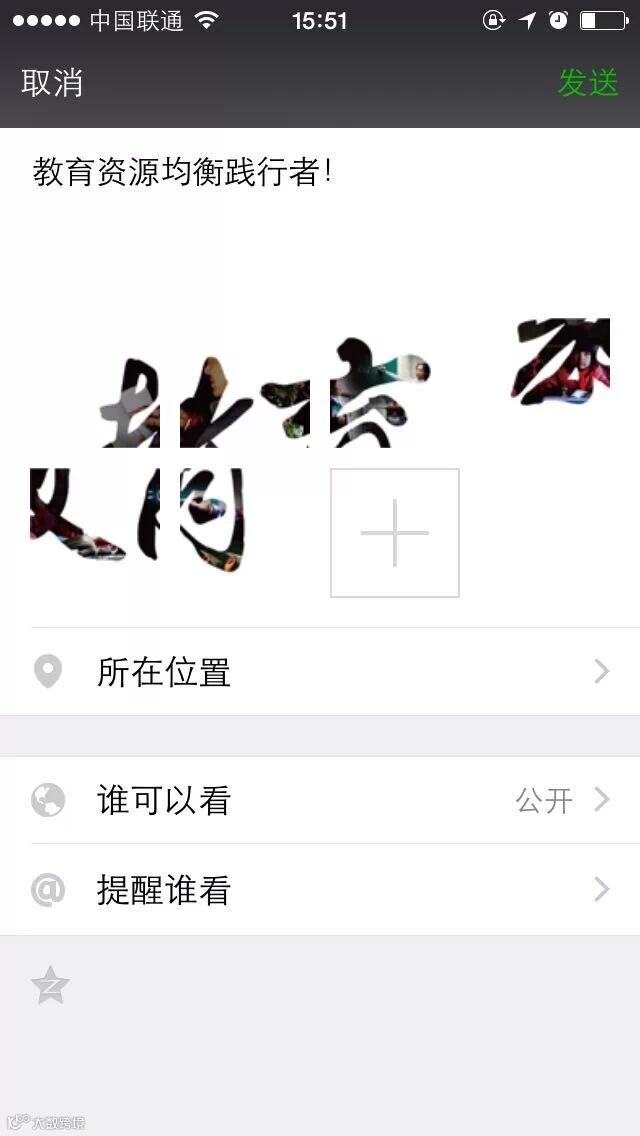 3,按照以往发布微信的步骤,填写文字内容:教育资源均衡践行者!并从刚刚保存图片的相册中依次勾选图片。操作完毕后直接发布即可。