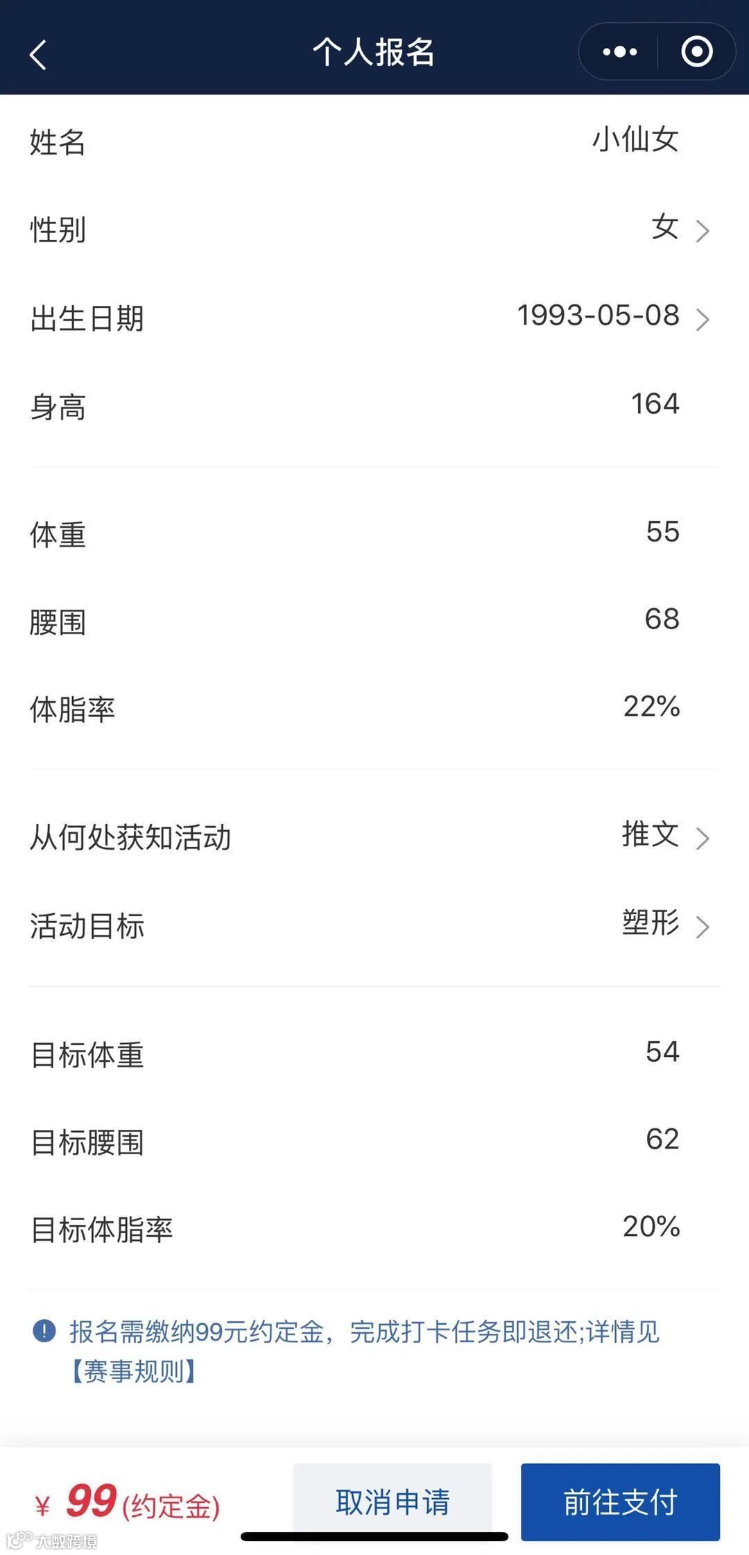 3、队员通过小程序报名,缴纳¥99元约定金(约定金规则见下文)。