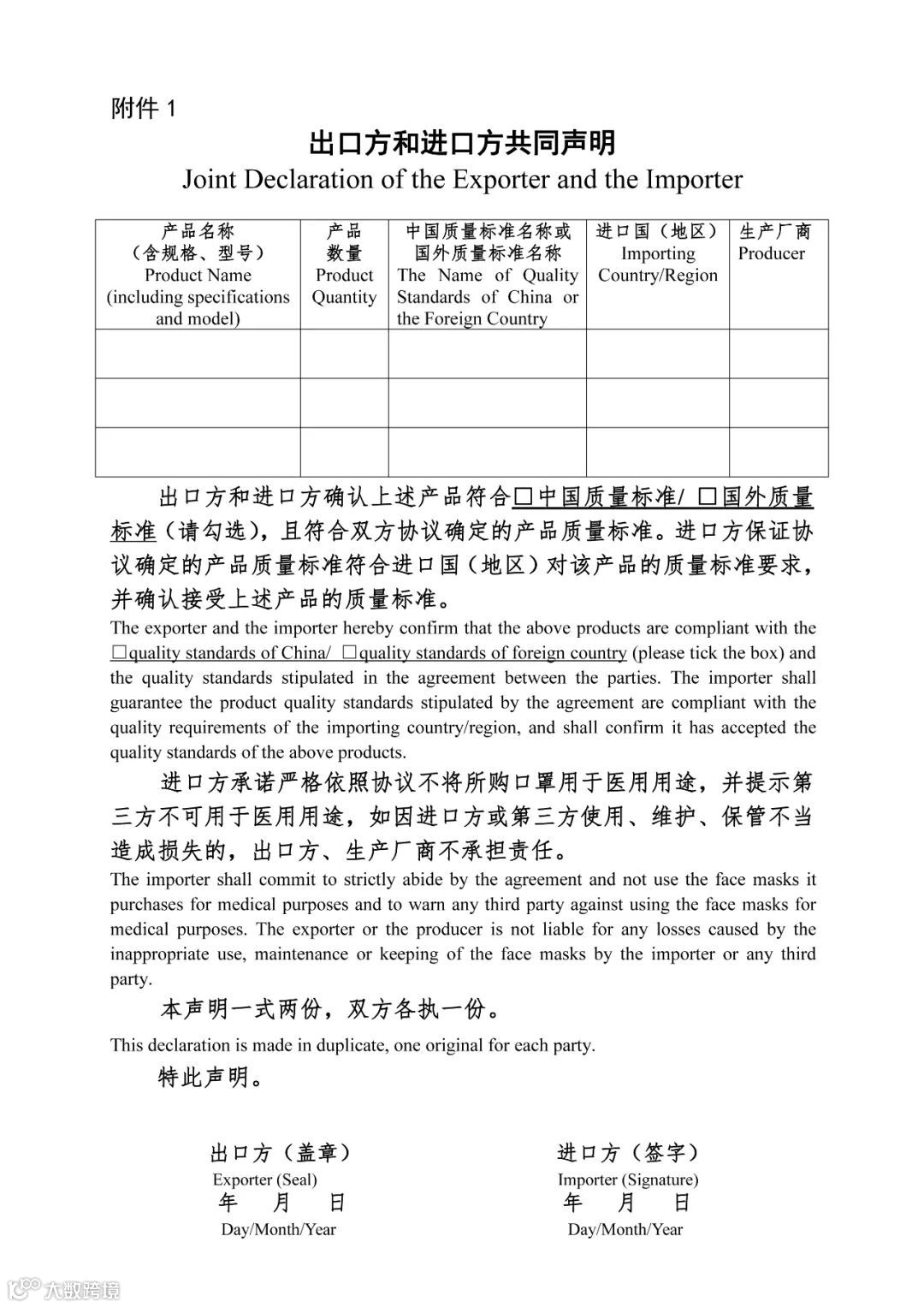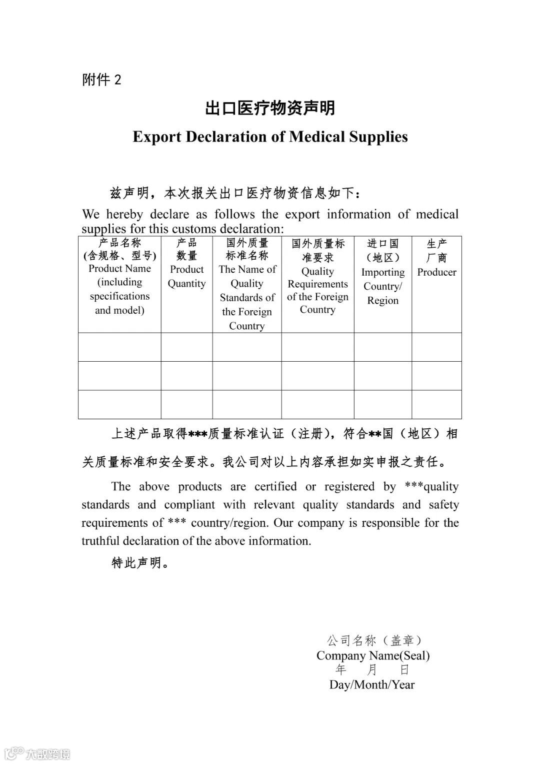 2、出口医疗物资声明。