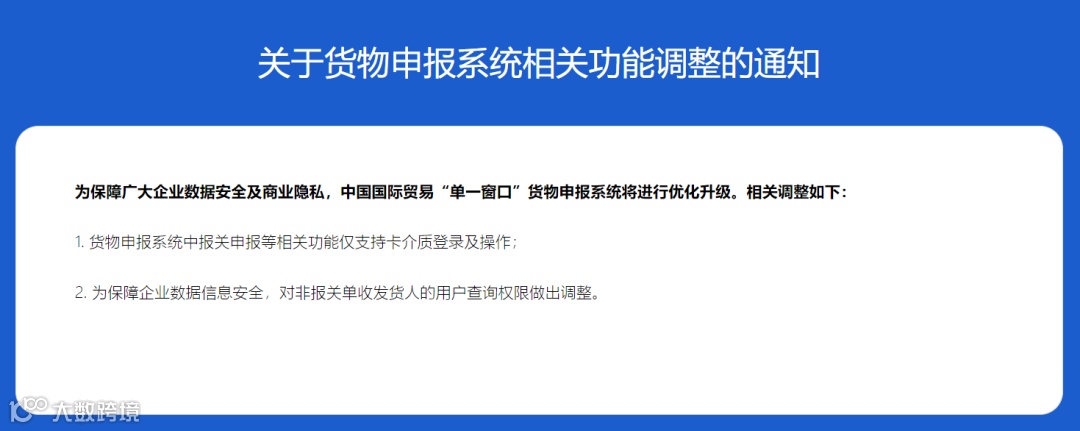 9月21日,单一窗口发布关于货物申报系统相关功能调整的通知,为保障企业数据安全及商业隐私,货物申报系统中报关申报等相关功能仅支持卡介质登录及操作,对非报关单收发货人的用户查询权限做出调整。