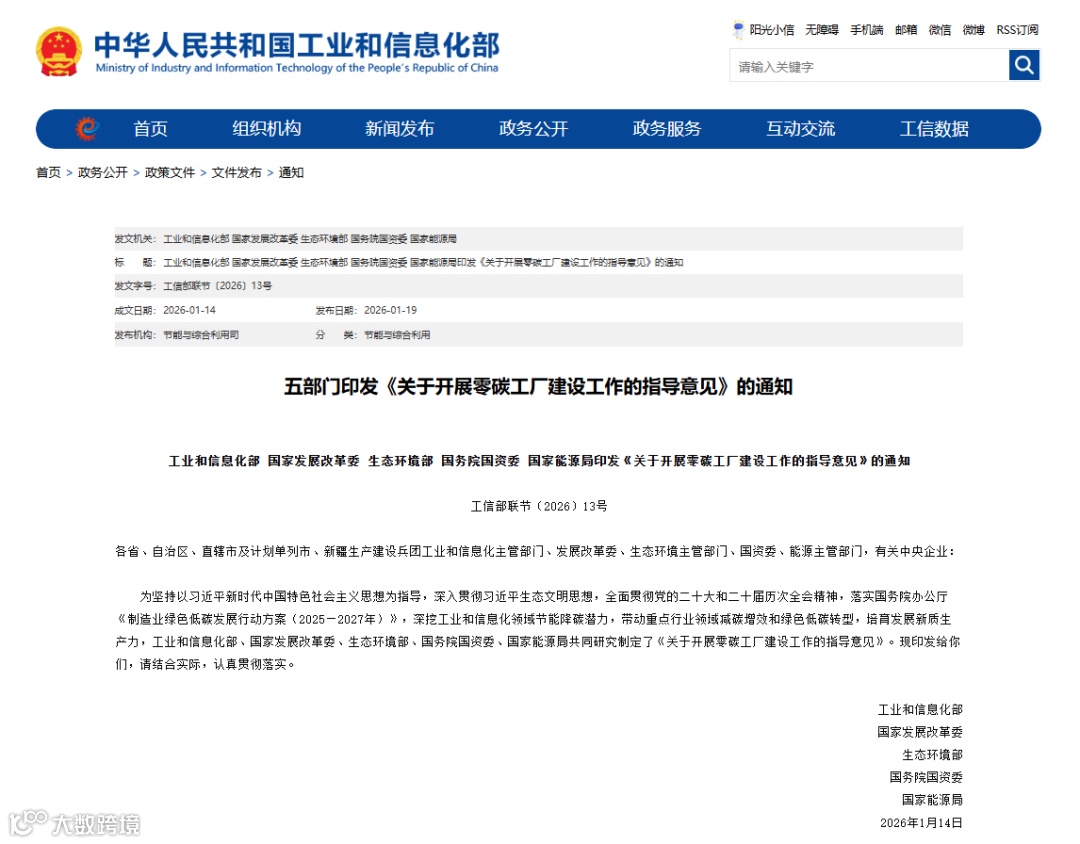 近日,工业和信息化部、国家发展改革委、生态环境部、国务院国资委、国家能源局等五部门联合印发《关于开展零碳工厂建设工作的指导意见》(工信部联节〔2026〕13号,以下简称《指导意见》),深挖工业和信息化领域节能降碳潜力,带动重点行业领域减碳增效和绿色低碳转型,培育发展新质生产力。
