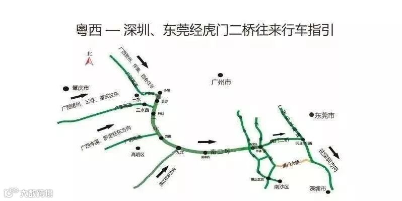 广州番禺区-东莞、深圳市区:广珠西线/东新高速/广珠北段高速-南二环高速-虎门二桥-广深沿江高速-东莞、深圳市区。