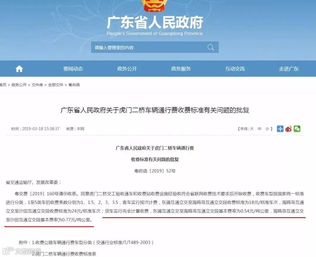 根据《广东省人民政府关于虎门二桥车辆通行费收费标准有关问题的批复》,货车实行完全计重收费,东涌互通立交至海鸥岛互通立交段基本费率为0.54元/吨公里,海鸥岛互通立交至沙田互通立交段基本费率为0.77元/吨公里。