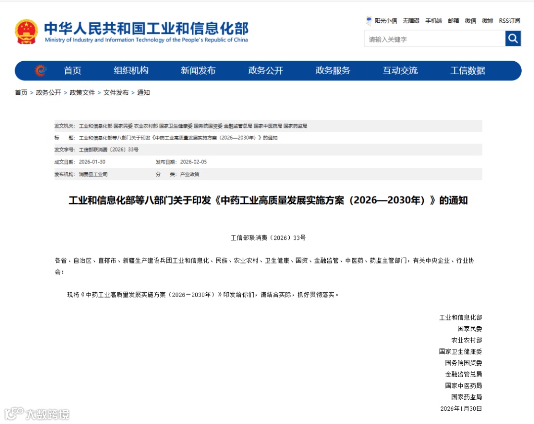 为加快落实《国务院办公厅关于提升中药质量促进中医药产业高质量发展的意见》,进一步推动中药工业全产业链协同和高质量发展,工业和信息化部、国家民委、农业农村部、国家卫生健康委、国务院国资委、金融监管总局、国家中医药局、国家药监局等八部门近日联合印发《中药工业高质量发展实施方案(2026—2030年)》(以下简称《实施方案》)。
